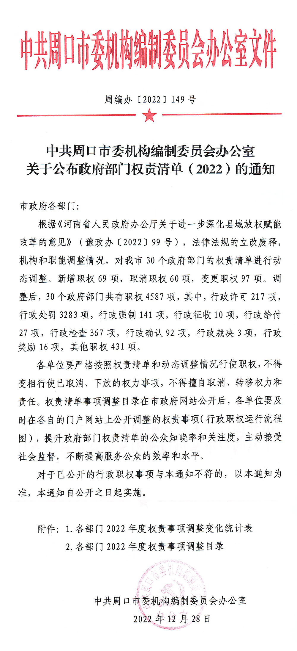 周编办[149]号:关于公布政府部门权责清单(2022)的通知