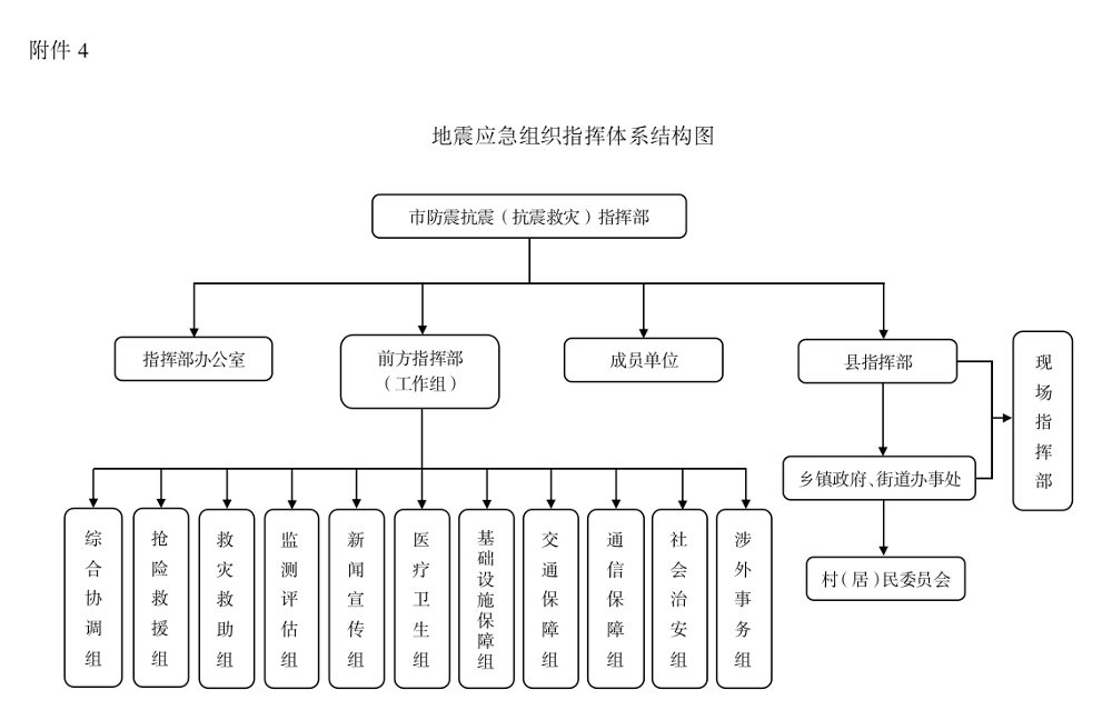 县、乡两级可参照成立防震抗震(抗震救灾)指挥部(以下简称县指挥部、乡指挥部),在同级党委和政府统一领导下,组织、指挥、协调本行政区域地震灾害应对工作;贯彻市委、市政府关于地震应急救援工作的决策部署;根据工作需要设立现场指挥部。
