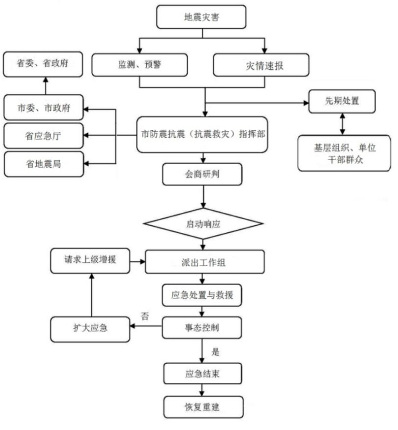 地震灾害发生后,灾区所在地的县、乡两级政府立即按照本级应急预案,启动防震抗震(抗震救灾)指挥部,组织指挥地震应急处置工作,发动当地基层组织、单位、干部群众开展自救互救,同时组织协调当地救援力量开展救援抢险。及时向市政府、市应急局报告灾情和震情。省指挥部启动应急响应后,市、县两级政府配合省指挥部开展抗震救灾工作。市指挥部启动应急响应后,县、乡两级政府配合市指挥部开展抗震救灾工作。