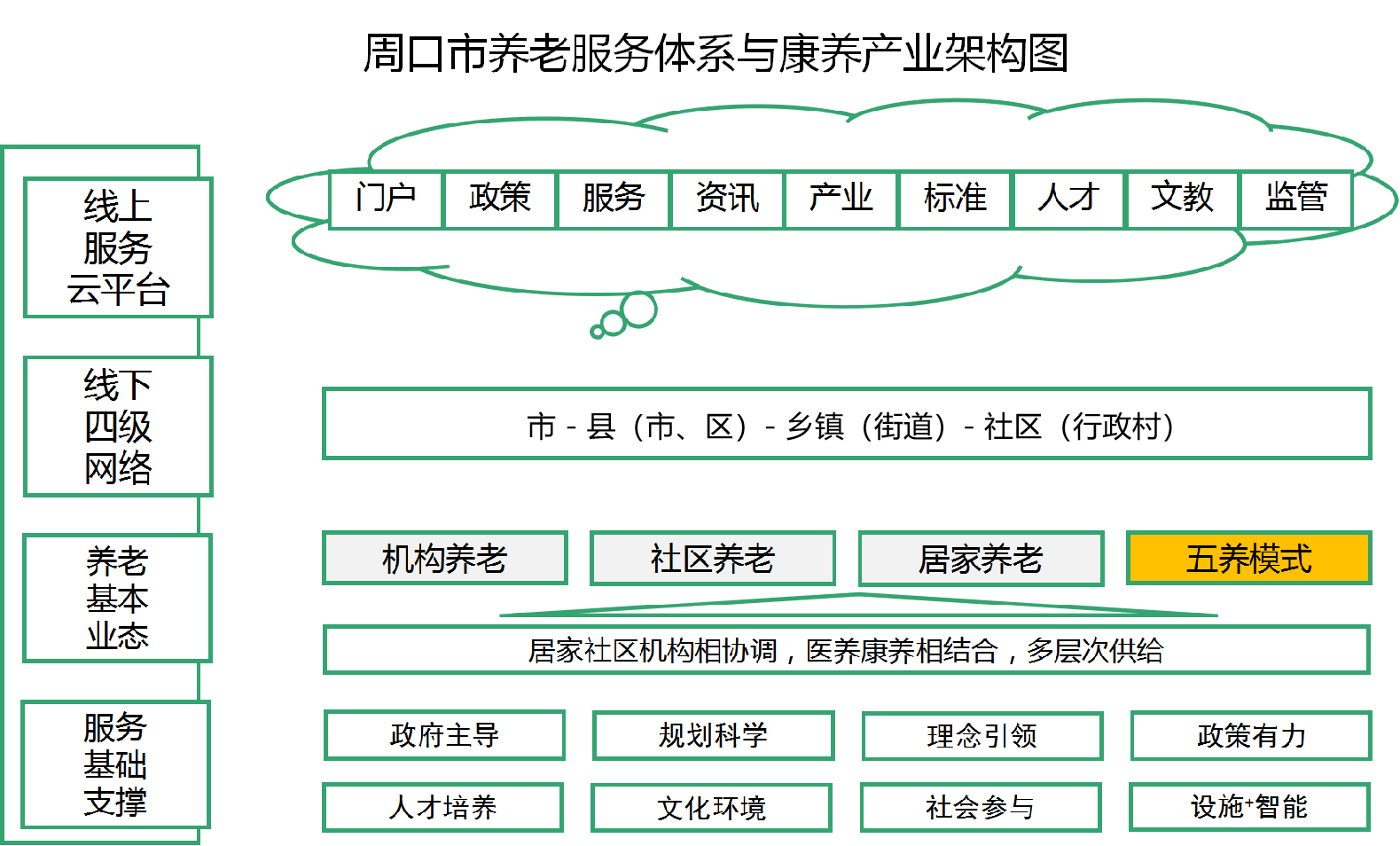 我市“十四五”养老服务体系和康养产业发展战略架构包含四个板块。搭建一个智慧化养老服务线上平台,整体实现“互联网+养老”线上服务功能;构筑线下四级服务网络,为确保养老服务的落地提供保障;基本养老服务业态和特色;实现养老服务的基础支撑。